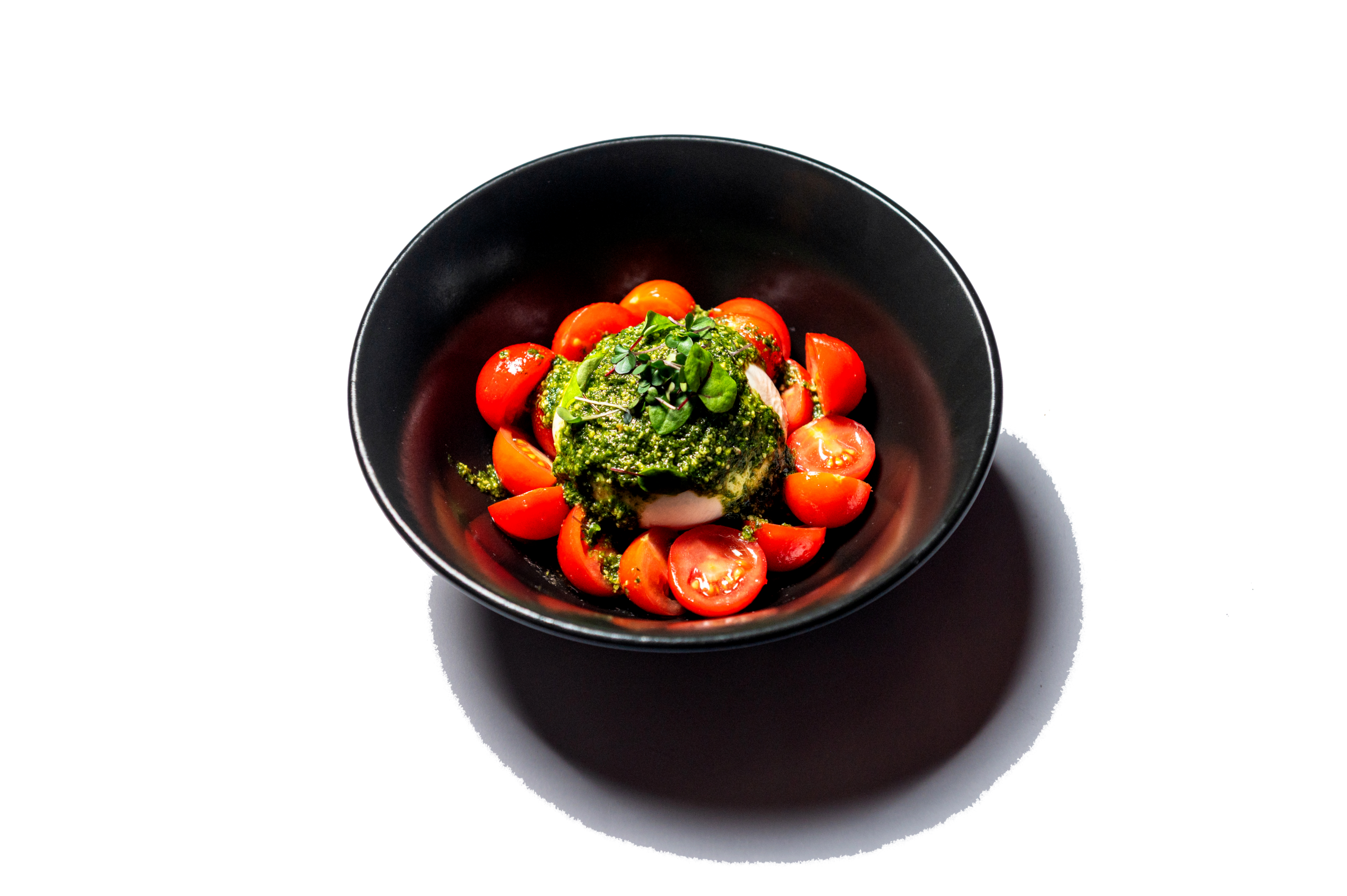 Burrata e freskët dhe kremoze, e shoqëruar me pomodorini të ëmbël, vaj ulliri dhe pesto borziloku. Një sallatë e lehtë dhe delikate, me shije mesdhetare dhe aromë të freskët.